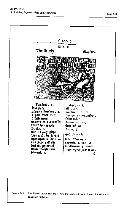 <!-- English text --> <div id=E98 lang=EN><head>The Study</head> <p><seg id=E9801>The Study</seg> <seg id=E9802>is a place</seg> <seg id=E9803>where a Student,</seg> <seg id=E9804>a part from men,</seg> <seg id=E9805>sitteth alone,</seg> <seg id=E9806>addicted to his Studies,</seg> <seg id=E9807>whilst he readeth</seg> <seg id=E9808>Books,</seg> <!-- ... --> </div> <!-- Latin text --> <div id=L98 lang=LA><head>Muséum</head> <p><seg id=L9801>Museum</seg> <seg id=L9802>est locus</seg> <seg id=L9803>ubi Studiosus,</seg> <seg id=L9804>secretus ab hominibus,</seg> <seg id=L9805>solus sedet,</seg> <seg id=L9806>Studiis deditus,</seg> <seg id=L9807>dum lectitat</seg> <seg id=L9808>Libros,</seg> <!-- ... --> </div>